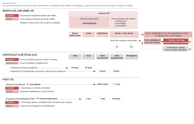 Segons el Decret 67/2105 de 5 de maig és obligació de la propietat conservar i rehabilitar els immobles per tal de mantenir-los en condicions d’ús efectiu i adequat. Com a verificació del compliment d’aquest deure, la propietat és la responsable d’encarregar la Inspecció Tècnica d’Edificis d’habitatges (ITE). En cas de ser necessari, igualment hauran de fer-se càrrec de les obres de reparació per esmenar les deficiències detectades en els terminis indicats.